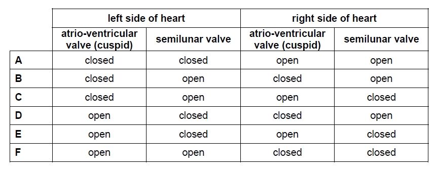 Which row of the table shows the state of the heart valves when the heart pumps blood to the lungs?