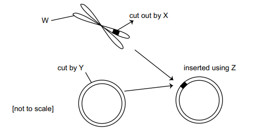 The correct answer is B: W – Chromosome, which is shown by its characteristic ‘X’ shape during metaphase. X – restriction enzyme, as restriction enzymes are used to cut out a portion of DNA from the donor organism. Y – restriction enzyme, as the plasmid (shown by its circular structure) has to be cut up using the same restriction enzymes as used to cut the donor DNA, as they leave the same sticky ends. Z – ligase. This enzyme seals up and joins together the sticky ends of the plasmid – donor DNA – gene complex.