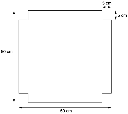 Folding up the sides takes 2 lots of 5cm off each side and gives the box a height of 5cm, making the dimensions in cm: 50-(5×2) by 50-(5×2) by 5 = 40 by 40 by 5. So the colume would be 40x40x5=8000cm cubed.
